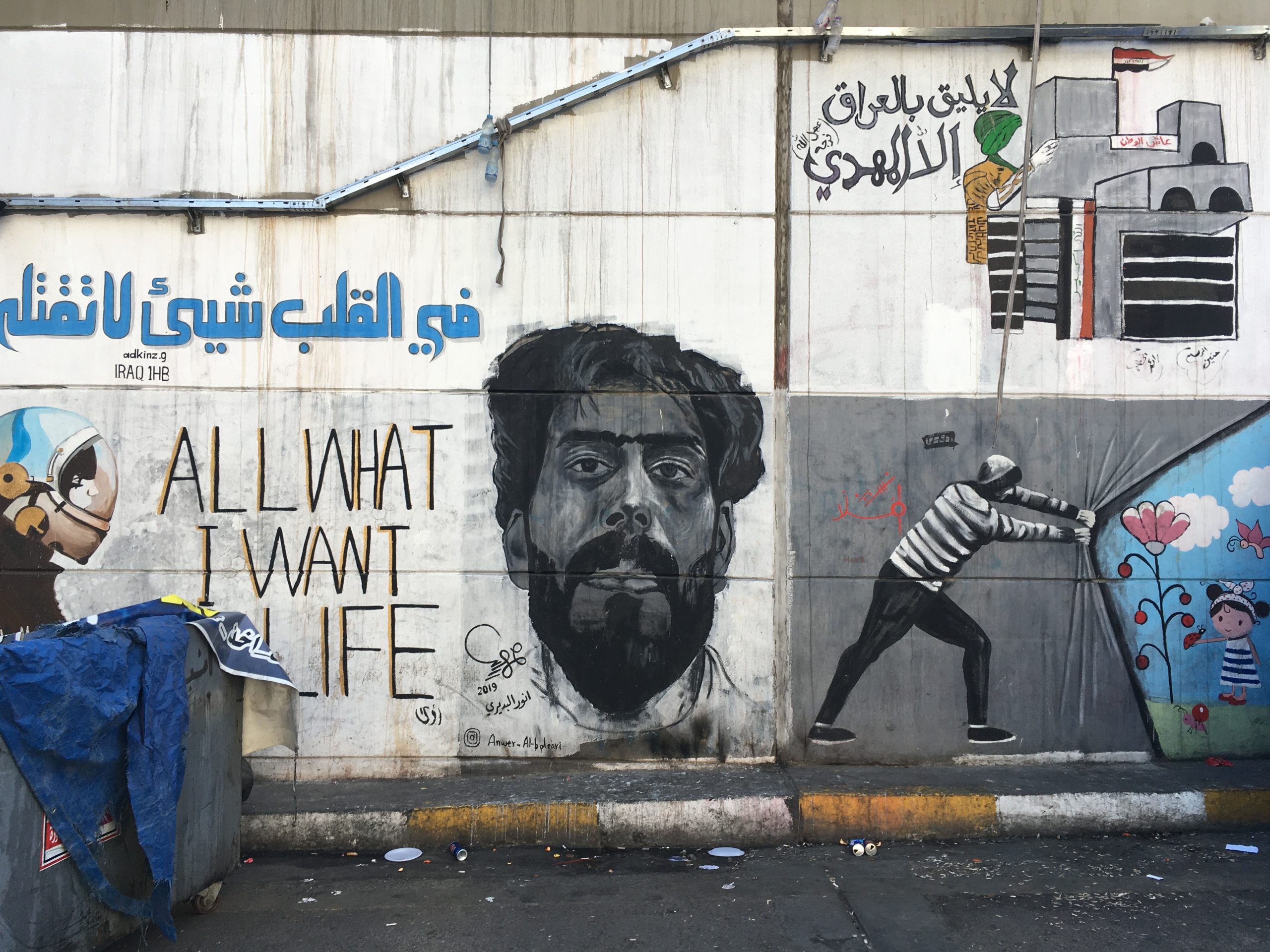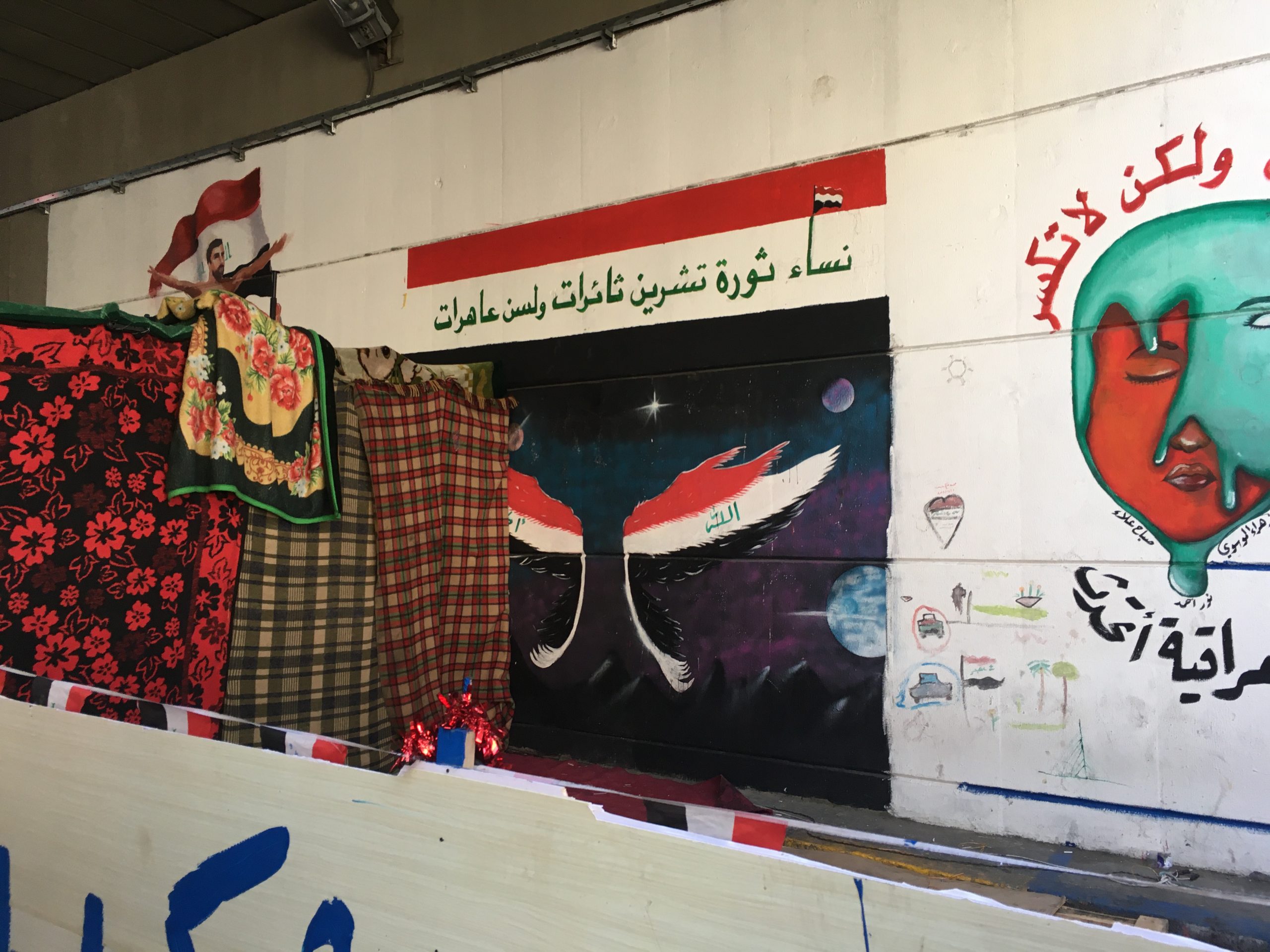 El levantamiento de octubre de 2019 se opuso a las fuerzas de la muerte (o necropolítica) en su celebración de la vida: las plazas se convirtieron en espacios de fiestas alegras, baile, bromas y juegos. Otro eslogan recurrente entre los jóvenes era Inryd In‘ysh, que significa “queremos vivir una buena vida lejos de la violencia armada y los conflictos políticos”. Estas formas de “florecimiento de la vida” implicaban una política de emoción y eran provocadas por ella. Los manifestantes establecieron una playa pública en el río Tígris, donde los jóvenes iban a relajarse y recrearse. También se establecieron cines y teatros en la plaza Tahrir, que mostraban diferentes tipos de obras dramáticas (en general relacionadas con problemas sociales y de la sociedad). Algunas actividades habituales en la plaza incluían sentarse y leer en las diferentes bibliotecas públicas, escuchar conferencias públicas ofrecidas por escritores, intelectuales y amantes de la cultura, y participar en debates y discusiones. Se organizaban talleres de pintura y dibujo, y las calles, el Monte Uhud y el túnel alrededor de la plaza estaban cubiertos con diversas formas de arte, algunas mostraban escenas de unidad nacional, otras denunciaban la opresión y la matanza de manifestantes y celebraban a las mujeres, los jóvenes y los mártires de la protesta, como Safaa al Sarai (véase la imagen 1).