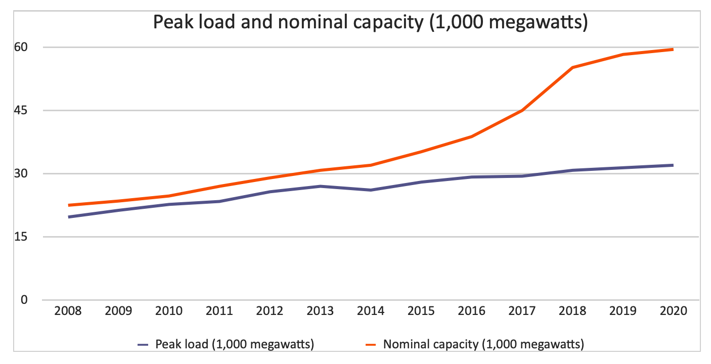 Figure VI: Peak load and nominal capacity (1,000 megawatts)