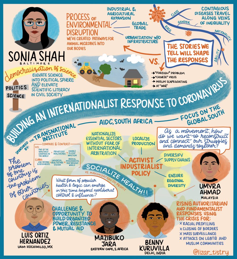 Unleashing fear and confusion among citizens and states across the world, COVID-19 demanded an internationalist response as it exposed social inequalities and the inadequacies of public health systems in developing and industrialised economies. The panel explored the global dimensions of the pandemic, discussed what resistance and solidarity can look like and the ways social movements may organise an internationalist response.