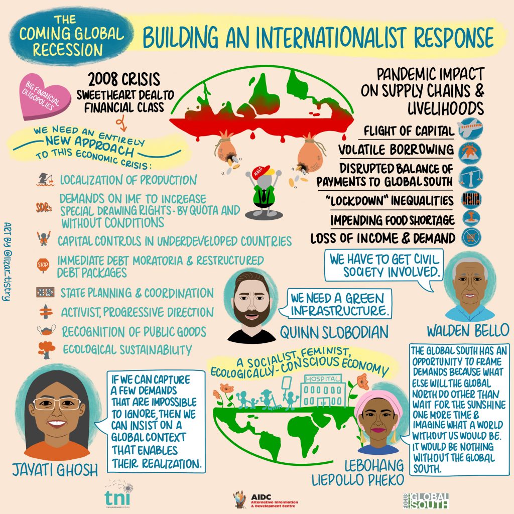 Jayati Ghosh notes the need to make immediate demands that are ‘socialist, feminist and ecologically conscious’. These include pressuring the IMF to create global liquidity and a debt moratorium, encouraging developing countries to instigate capital controls and better localise employment, production and consumption, and ensure that public goods like health and care work are recognised and protected. Progressive forces are weak, but may be able to revive by ‘capturing people’s imagination’ and creating enough public support that governments might cede to their demands.