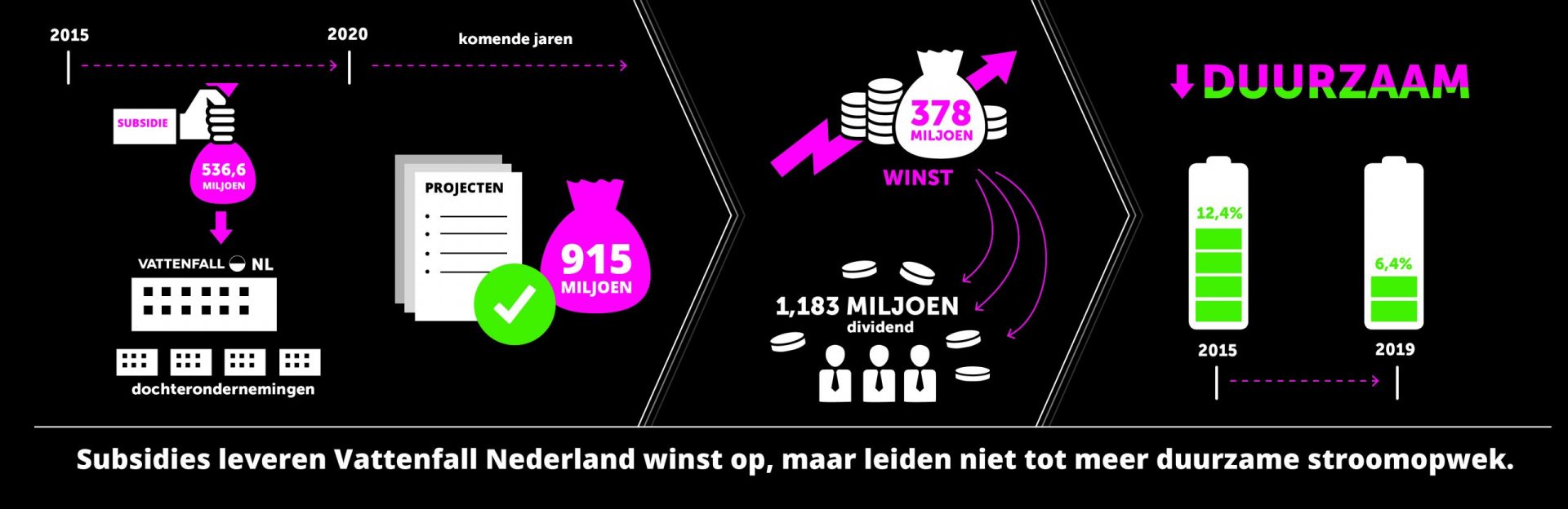 Vattenfall Nederland maakte in de afgelopen vijf jaar 387 miljoen euro winst en keerde maar liefst 1,183 miljard euro uit aan dividend. In 2019 ging 750 miljoen euro aan dividend naar moederbedrijf Vattenfall SE, dat volledig in handen is van de Zweedse overheid. Met dank aan de bijdrage van de dochter behaalde het moederbedrijf een winst van 1,469 miljard euro. De helft van dit bedrag ging volgens het jaarverslag naar de aandeelhouders.