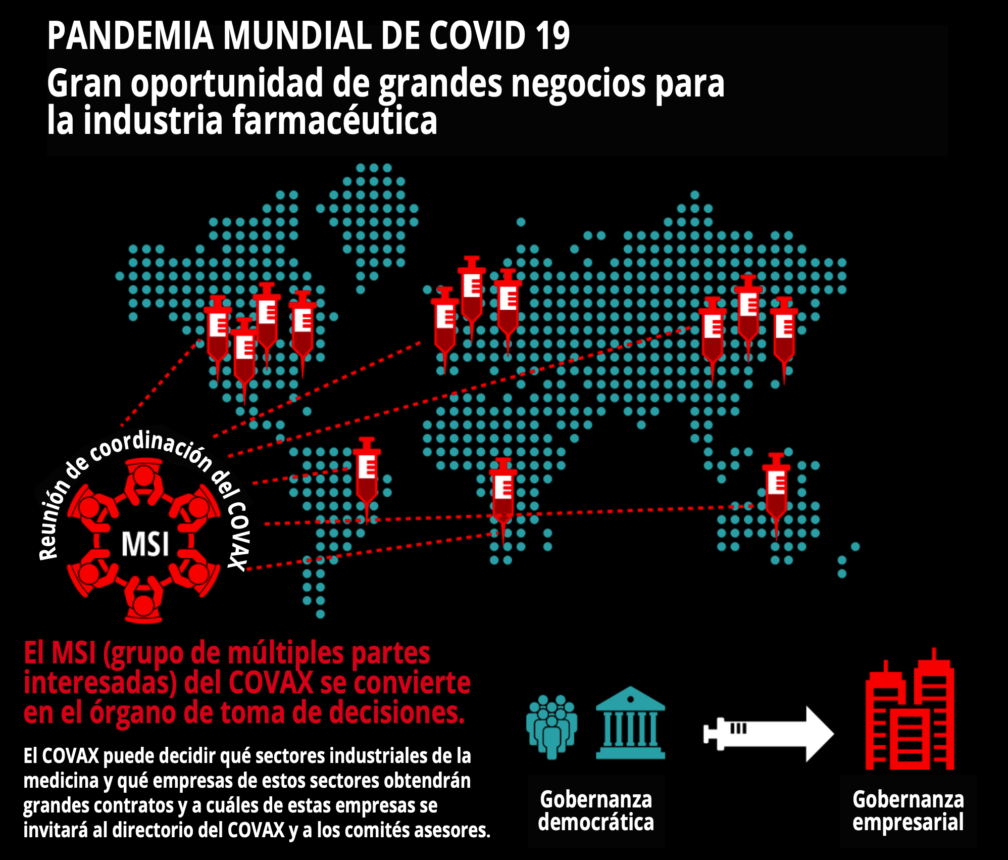 El interés del COVAX de proteger los mercados comerciales también se ve reflejado en su reconocimiento de las grandes farmacéuticas como ‘parte interesada’, a la vez que les niega esa condición a quienes necesitan servicios de salud o a quienes pudiesen abogar por respuestas alternativas del sector público. También se manifiesta en su no adhesión a una cláusula de exención de las normas de la OMC, acordada anteriormente en respuesta a la pandemia del SIDA, que habilita a los fabricantes y distribuidores de países en desarrollo a producir productos y procesos relacionados con la COVID sin las restricciones propias de las normas ordinarias en materia de derechos de propiedad intelectual.