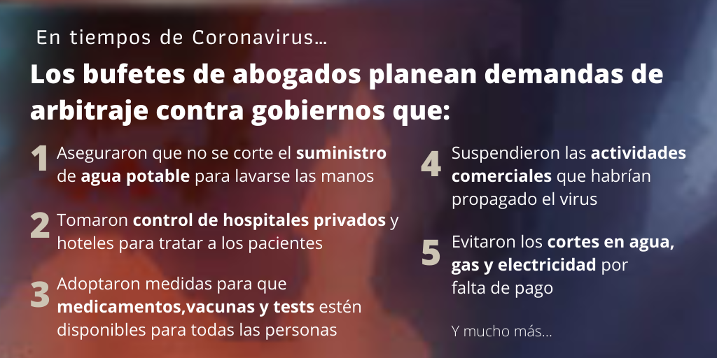 En medio de una crisis sin precedentes, el sector jurídico está preparando el terreno para entablar demandas costosas en virtud del ISDS contra las medidas adoptadas por los Gobiernos para responder a los efectos de la pandemia del Coronavirus en la salud y la economía. En avisos escritos y webinarios, los bufetes de abogados informan a sus clientes multinacionales de las amplias protecciones de los acuerdos de inversión para los inversores extranjeros como una herramienta para “solicitar una reparación y/o indemnización por las pérdidas resultantes de las medidas adoptadas por los Estados” (entrada de blog de abogados de bufete Quinn Emmanuel).