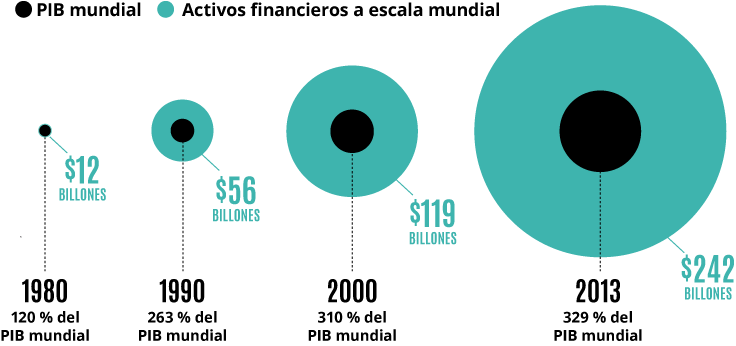 Gráfico del informe Estado del poder 2019 El sector financiero ha aprendido a financiarizar casi todo y ha crecido de forma exorbitante en relación con la economía global. Gráfico del informe Estado del poder 2019