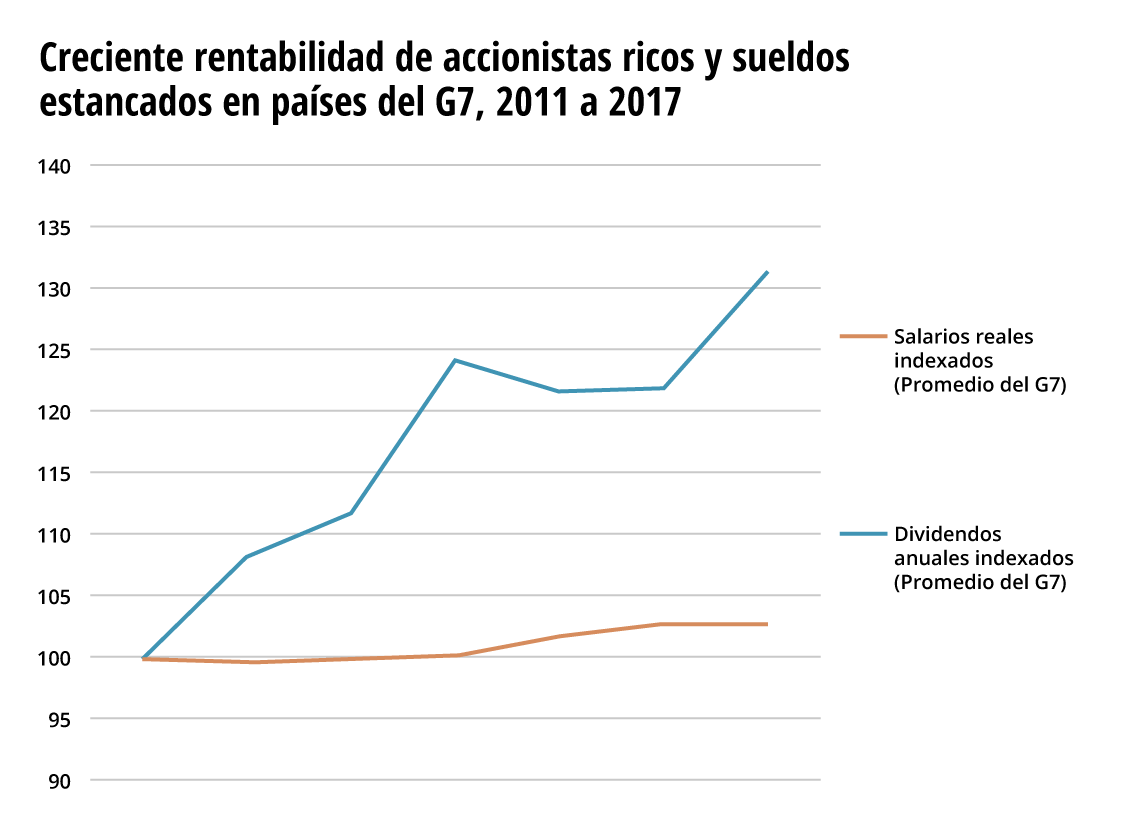 En los Estados Unidos, los accionistas recibieron casi 7 billones de dólares en forma de pago de dividendos y recompra de acciones, mientras que los ingresos de los trabajadores apenas aumentaron, lo que alimentó la desigualdad y también disminuyó el poder adquisitivo de los trabajadores.