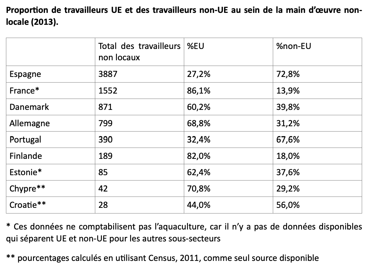 Enfin, bien qu'il n'existe pas de données fiables sur la main-d'œuvre migrante légalement employée dans le secteur de la pêche dans les États membres de l'UE, l'étude de la Commission européenne de 2016 tente de compiler les sources de données existantes. Les auteurs affirment qu’