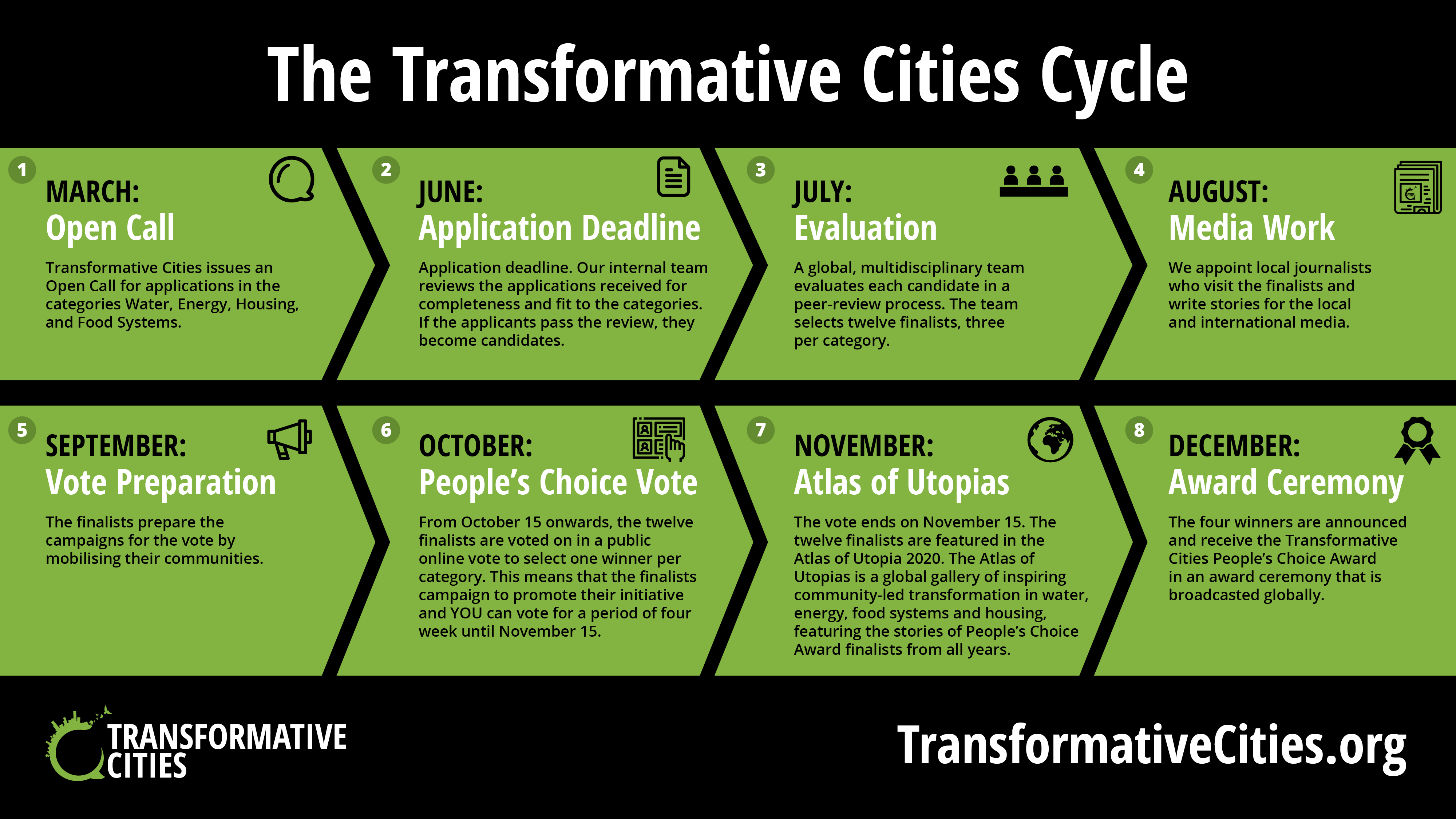 This is, therefore, one of the main differences between the Transformative Cities People’s Choice Award and other awards, as instead of calling for initiatives that meet a previously established definition of what a transformative city is, we seek to learn from a broad and diverse transformation process carried out at the local level around certain concrete demands, which are our award categories, namely, water, food, energy, and housing. We consider these four to be essential demands for the lives of people anywhere on the planet. We could say that together they refer to a political struggle for survival, which makes them necessary and vital for any political community.