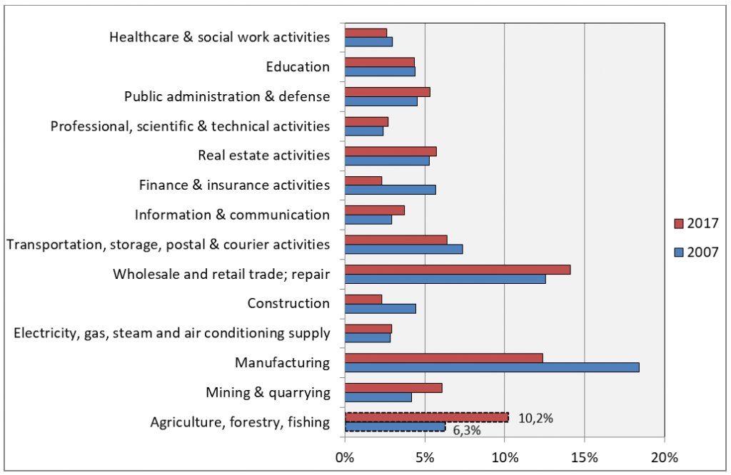 Figure 2. Sectoral structure of Ukraine’s economy and sectoral contribution to GDP, 2007 and 2017