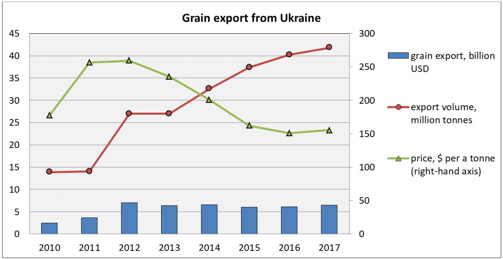 Figure 3. Export of grain from Ukraine in physical and monetary terms, 2010 to 2017
