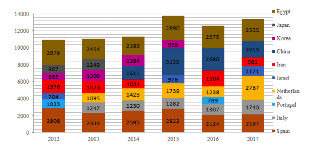 Figure 4. Destination of corn exports from Ukraine, 2012 to 2017, in thousand tonnes