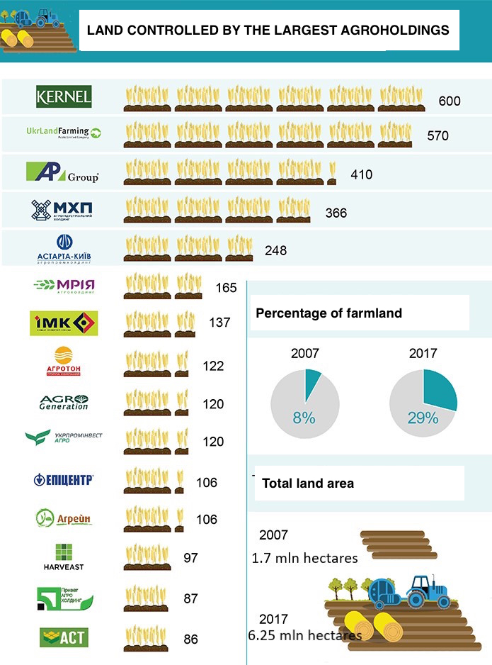 Agroholdings refer to large-scale farming enterprises with at least ten thousand hectares (ha) of land under management. They are an agglomeration of multiple farms and enterprises, often organisationally structured as a parent entity with control over subsidiary firms or corporate farms – what is also sometimes referred to as ‘Large Farm Management’ (LFM). There are 93 such LFM enterprises in Ukraine, each controlling over 10,000 ha. The average size of an agricultural enterprise forming part of an agroholding is 4,850 ha. Agroholdings are strongly associated with the type of large-scale farming that emerged in former Soviet states like Russia, Ukraine, and Kazakhstan. While the average farm size in Ukraine is 1,058 hectares, it is not unusual for farm sizes to reach up to 600,000 ha. This compares to an EU farm size average of 16,1 ha.