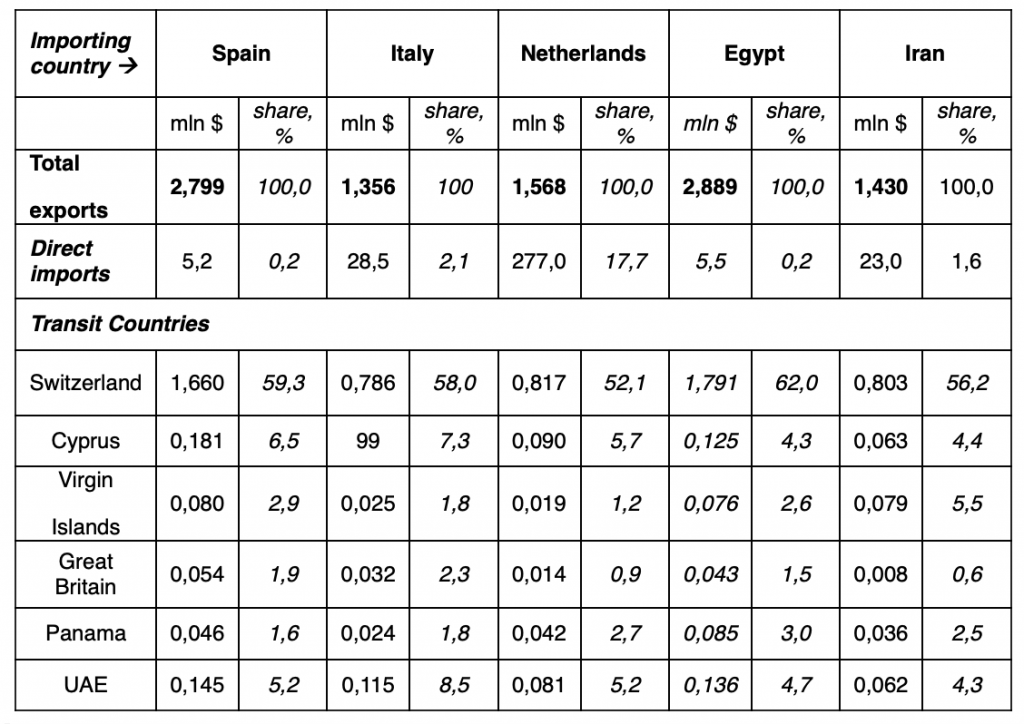 Explanation of figure: Using the example of the first column. The total Ukrainian exports of corn to Spain amounted to 2,799 million USD (or 2.8 billion USD) between 2012 – 2017. However, according to customs data, Spain received only 5,2 million worth of corn from Ukraine directly, just 0,2% of the total value. Most of the actual supply was carried out off-shore, through various transit countries e.g. 59% of the total corn exports from Ukraine to Spain transited through Switzerland (amounting to 1.660 million USD), 6,5% via Cyprus (amounting to 0,181 million USD) etc.