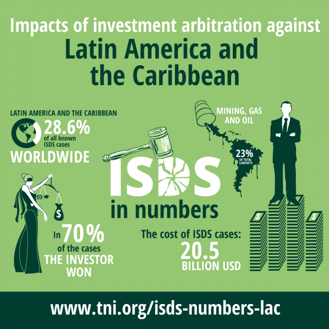 In fact, governments that dared to do so in the ‘post-neoliberal cycle’ in Latin America (2000–2015) were subjected to a total of 267 ISDS claims by foreign investors, equivalent to 28% of all known claims worldwide to date. Argentina, Venezuela and Mexico came in first, third and sixth place in the global list of countries with the highest number of such claims, of which several are related to human rights and environmental issues, or the Chevron-Ecuador case.