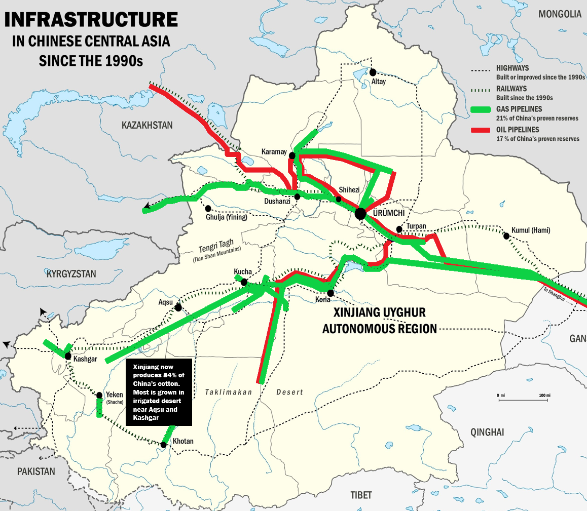 It was not until the 1990s, as China developed a market economy oriented to global capitalism, that the Uyghur majority areas of Southern Xinjiang – where Uyghurs represented more than 90% of the population – became the target of an internal settler colonial project. It was during this period that the oil and natural gas reserves of the region became the focus of profit-oriented state-owned or managed corporations. Since then, Xinjiang has become the source of around 20% of China’s oil and natural gas. It had an even higher percentage of China’s coal reserves and now produces around 20% of the world’s cotton and tomatoes.
