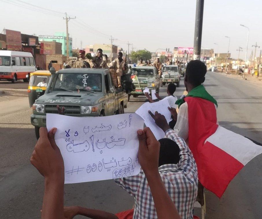 La huelga del 28 y 29 de mayo de 2019 – Revolucionarios en la calle muestran pancartas sobre la huelga a vehículos de las Fuerzas de Apoyo Rápido en Jartum. La pancarta dice: “¿Estás en huelga o eres del Umma? #GobiernoCivil (Partido Umma, uno de los principales partidos del país, que anunció su oposición a la huelga).